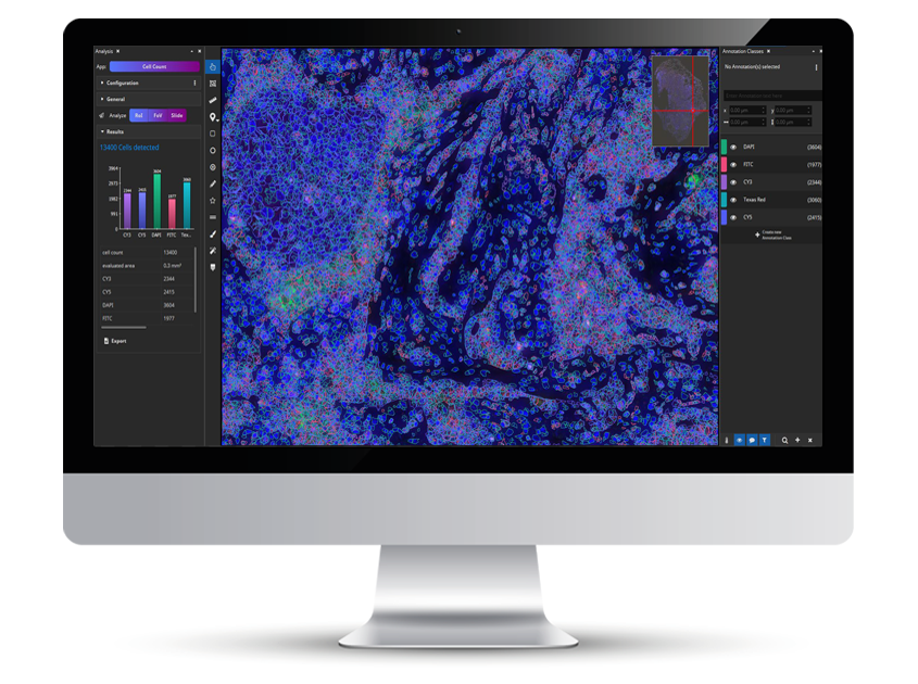 Das Auswerten histologischer Schnitte beansprucht in der Forschung viel Zeit. Zudem sind manuelle Tätigkeiten wie das Auszählen von Zellen oder die Flächenbestimmung ausgewählter Areale ermüdend und fehleranfällig. Unser Lösung ist MIKAIA® studio, vom Fraunhofer IIS entwickelt und bei Smart In Media erhältlich: Damit wird Ihre bildbasierte Analyse extrem beschleunigt, präziser und reproduzierbar!