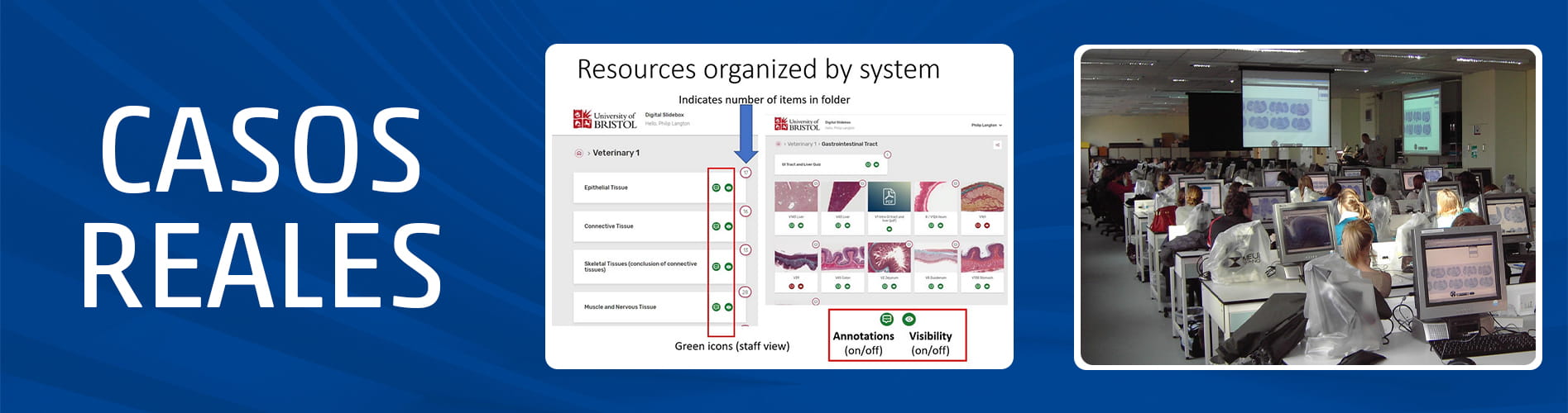 La Universidad de Bristol tiene un gran laboratorio de histología para estudiantes de medicina, odontología y veterinaria. El equipo incluye 125 microscopios y 125 cajas de muestras, cada una con 300-400 portaobjetos. La enseñanza clásica de la histología con microscopios era un desafío logístico: Todos los participantes del curso debían estar en la sala al mismo tiempo y una preparación de la misma muestra de tejido debía estar disponible para todos al mismo tiempo. Este gasto de material, así como la supervisión de los estudiantes en el microscopio, requería de cuatro a cinco profesores por clase.